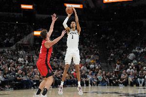 德克萨斯大学橄榄球队成员观战马刺 星三代曼宁与文班合影换球衣